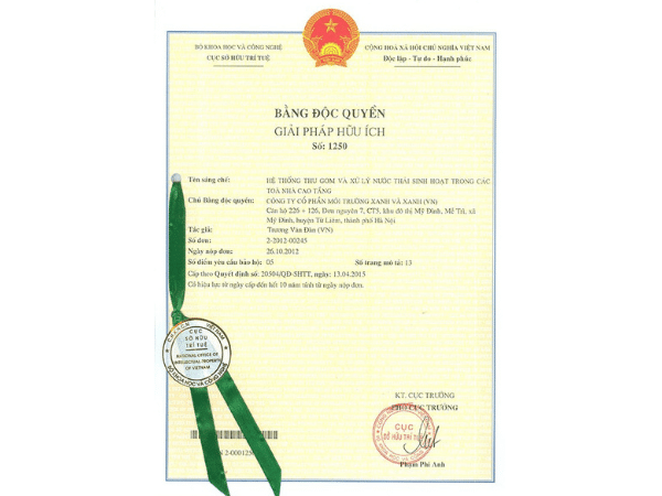 BẰNG SÁNG CHẾ ĐỘC QUYỀN HỆ THỐNG THU GOM VÀ XỬ LÝ NƯỚC THẢI SINH HOẠT TRONG CÁC TÒA NHÀ CAO TẦNG