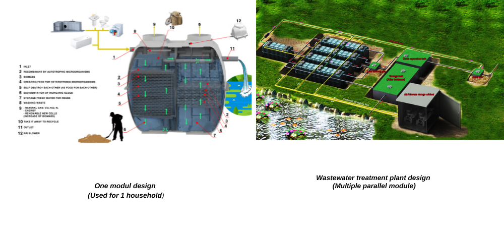 The equipment does not use decomposition technology with the existing process: Anaerobic, aerobic, sedimentation, disinfection. This works completely (100%) based on natural biological technology following the process: "BIODEGRADATION - RECOMBINATION - BIODEGRADATION". Where, completely no biological products, chemicals or physical rays are needed. The equipment for treating wastewater is very simple, which consists of a biological tank divided into 2 compartments; an air blower similar to an aquarium we normally see. Inside, the compartments have microbiological substrates attaching microorganisms. The equipment has a modular structure with many different module capacities whose scale is compatible with various demands from households (treatment equipments), or apartment buildings (very large treatment plants) ...