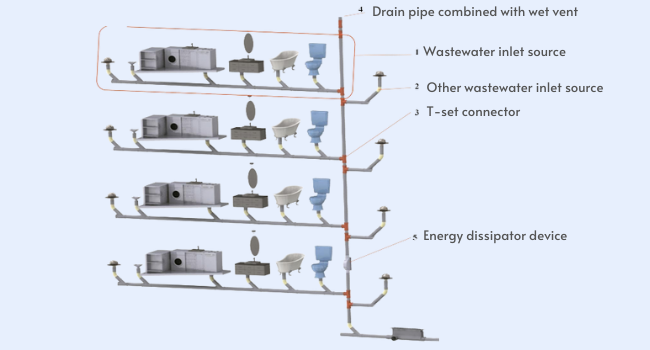 The main vertical pipe along a high-rise building uses a kinetic energy dissipator device in replacement of a pressure reducing system, and uses curved rods instead of Y connectors to transfer water from the horizontal axes into the vertical axis.