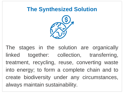 The comprehensive solution constitutes interior and exterior water drainage system, garbage filtering, waste treatment, henceforth helps to establish ecological balance and regulate humidity inside each part of any urban and residential area. The treatment system creates a direct infrastructure to reclaim wastewater under any circumstances, and decides completely on the reuse of urban and residential waste.