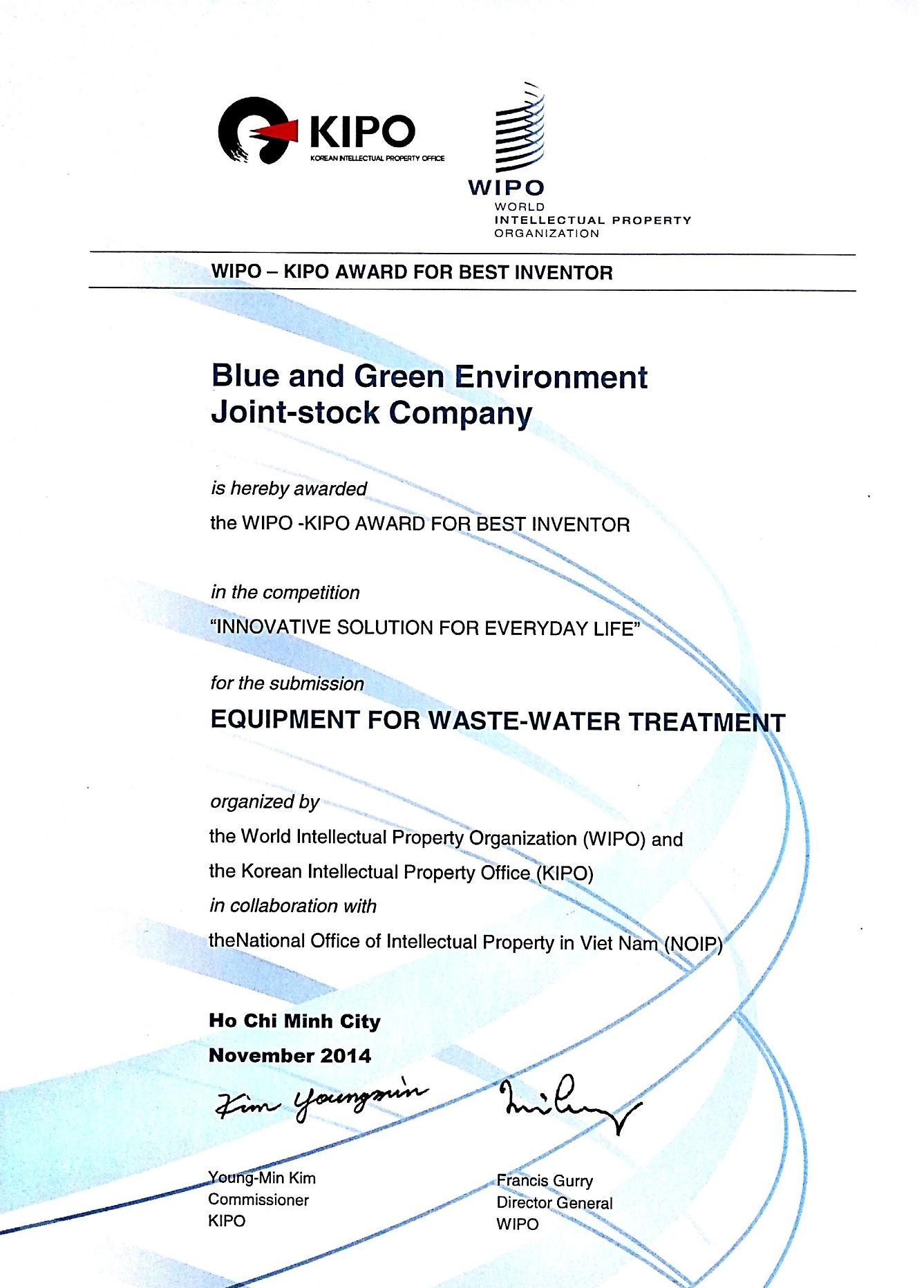 Đạt được giải nhì sáng chế Quốc tế (WIPO, KIPO, NOIP đồng tổ chức) vào năm 2014; Được WIPO lựa chọn là một trong 65 sản phẩm (trong lĩnh vực môi trường và năng lượng) xuất sắc nhất toàn cầu được triển lãm tại WIPO GREEN - UNDP "Hội nghị thượng đỉnh môi trường và biến đổi khí hậu toàn cầu - COP21" được tổ chức tại Paris từ 3/11 đến 11/11/2015.