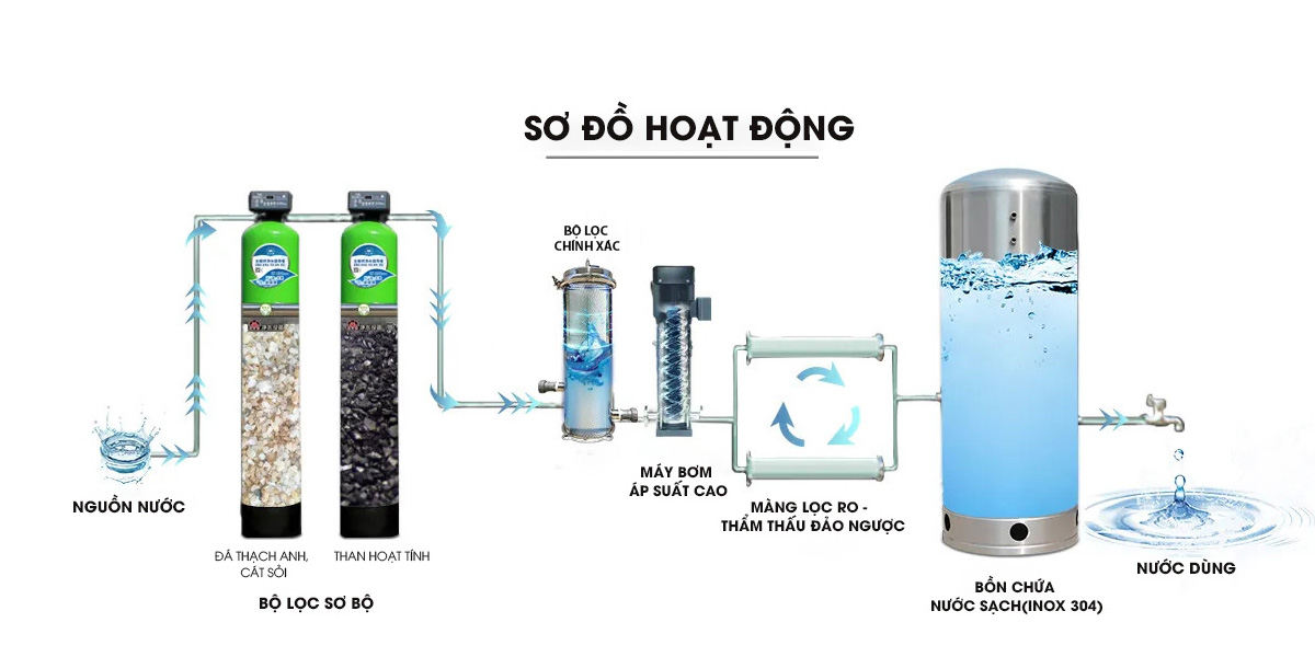 - Bơm cấp lọc (nếu cần) tăng áp suất đưa nước qua hệ thống bình lọc